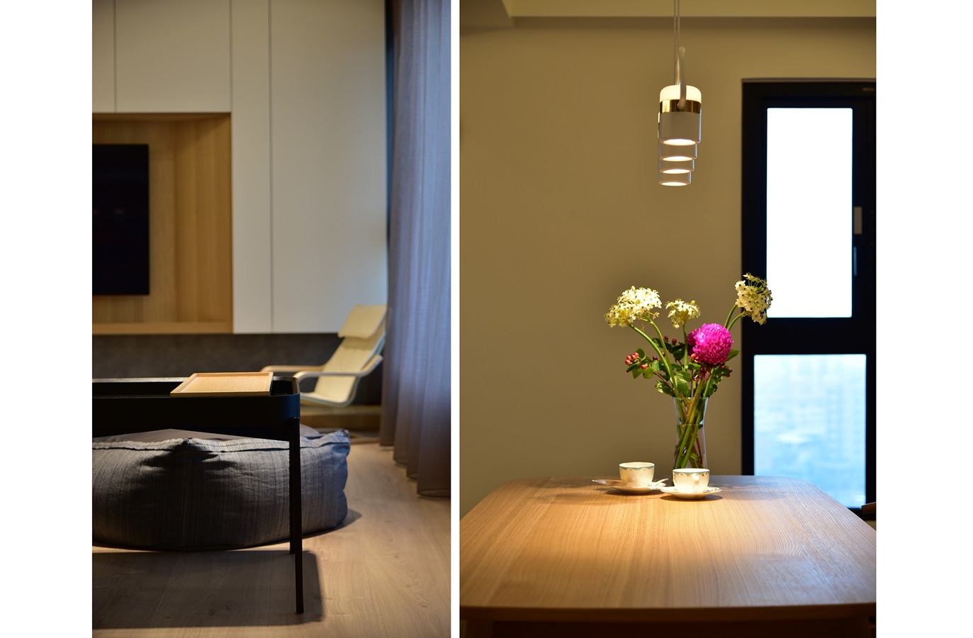 以無彩色的基調融合日系風格的簡約精神,配上木質感的色調溫潤了空間。