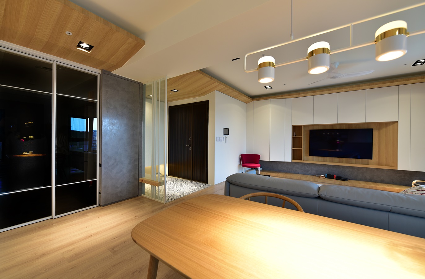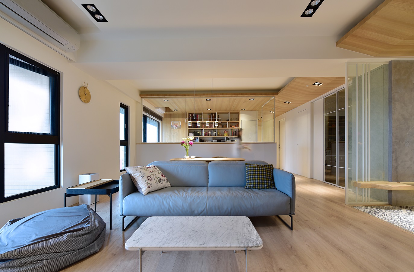 將廚房與客廳的關係連結,當拉門被開啟時公共空間的深度能最大化,並模糊了較為生硬的界線關係,讓使用者的互動與對話活絡;機能動線上也更有效率。