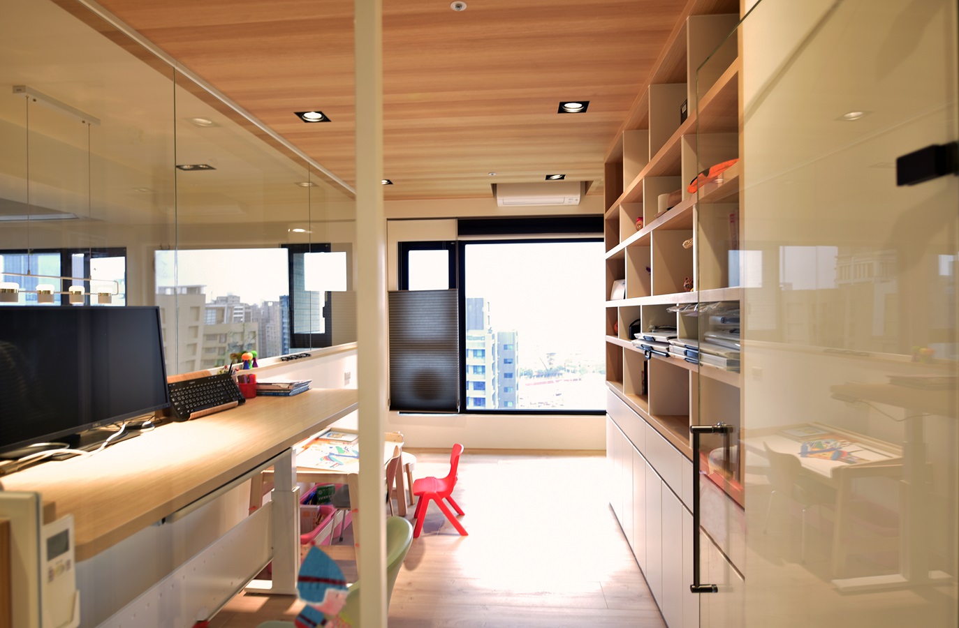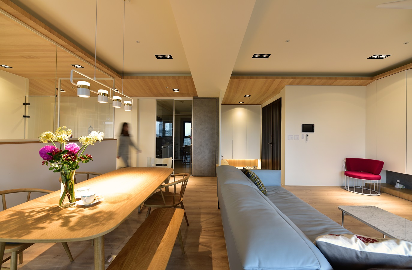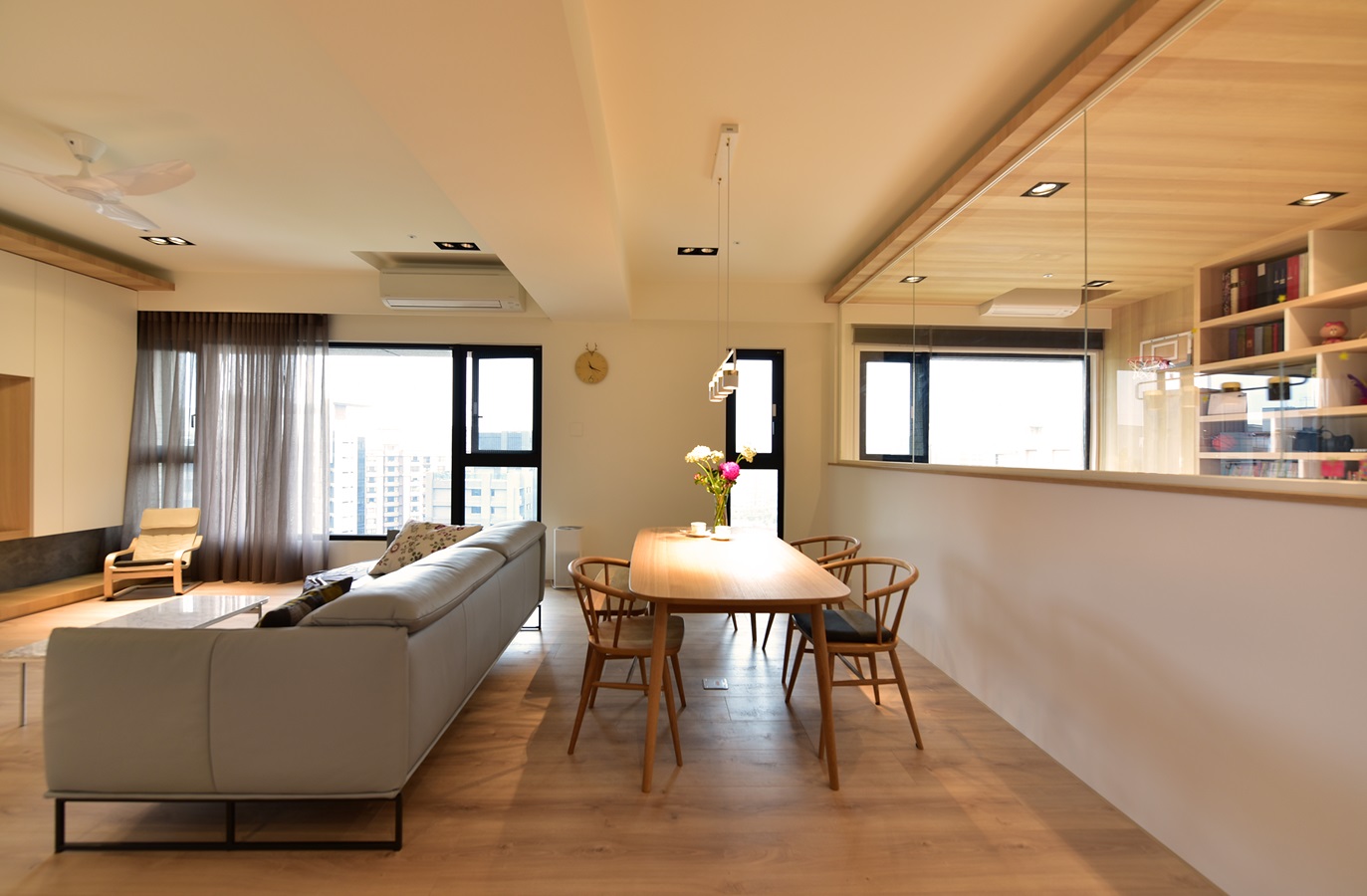 將公共空間及木皮天花作為軸線延伸,半開放書房的清透量體造型,