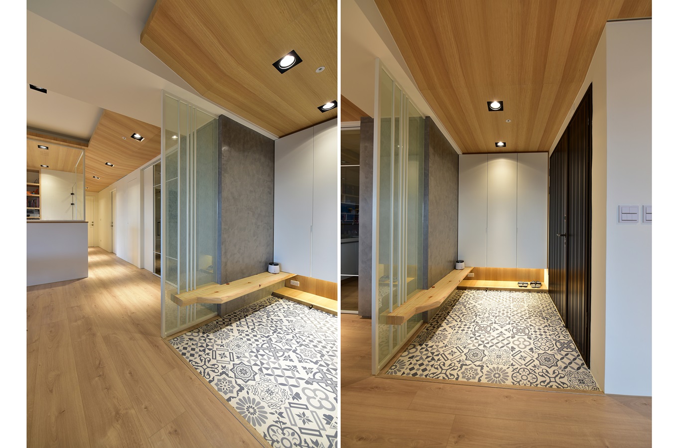公共空間延伸廊道木皮天花拉長視覺延伸感,凸顯筆直軸線。